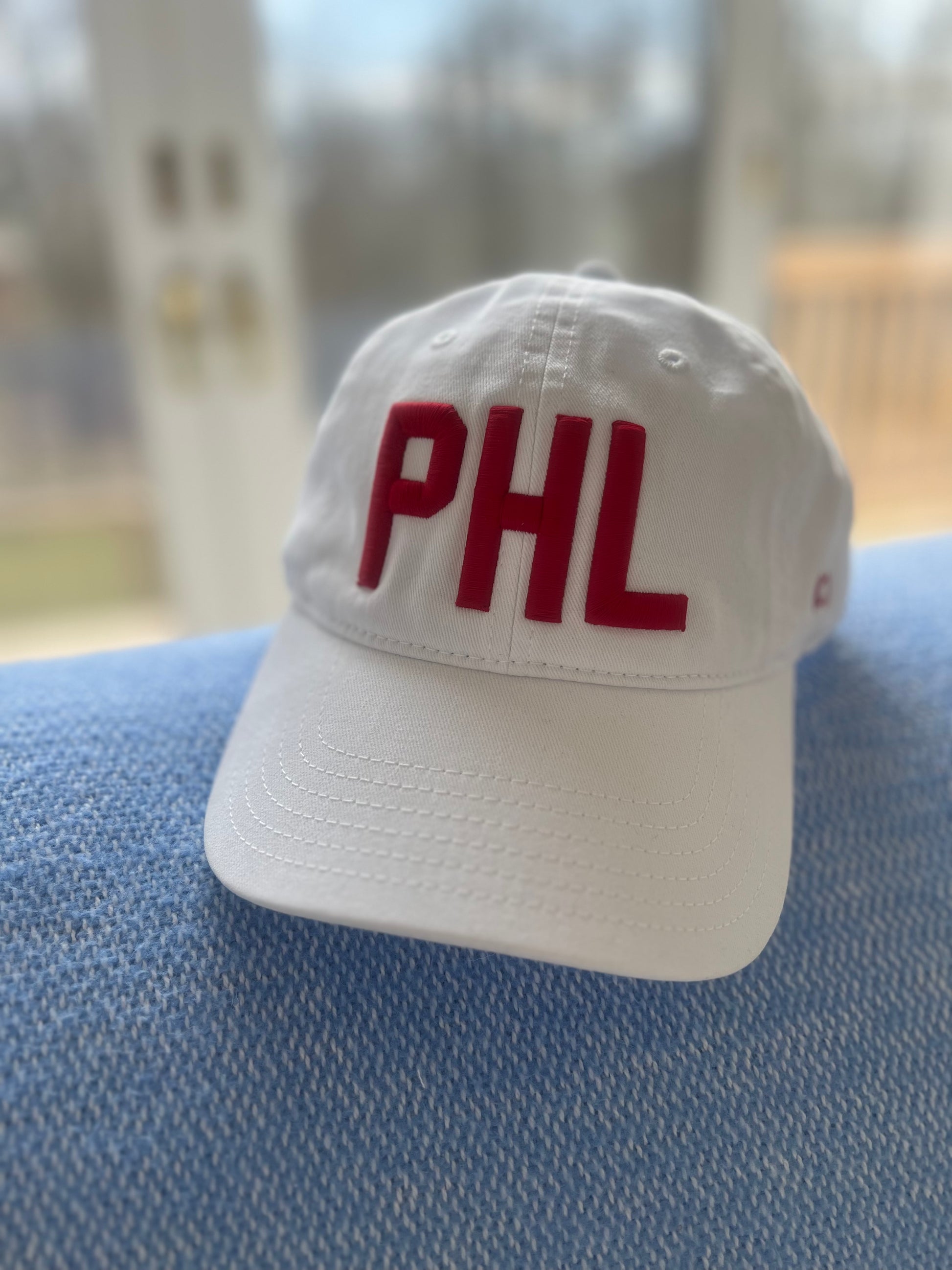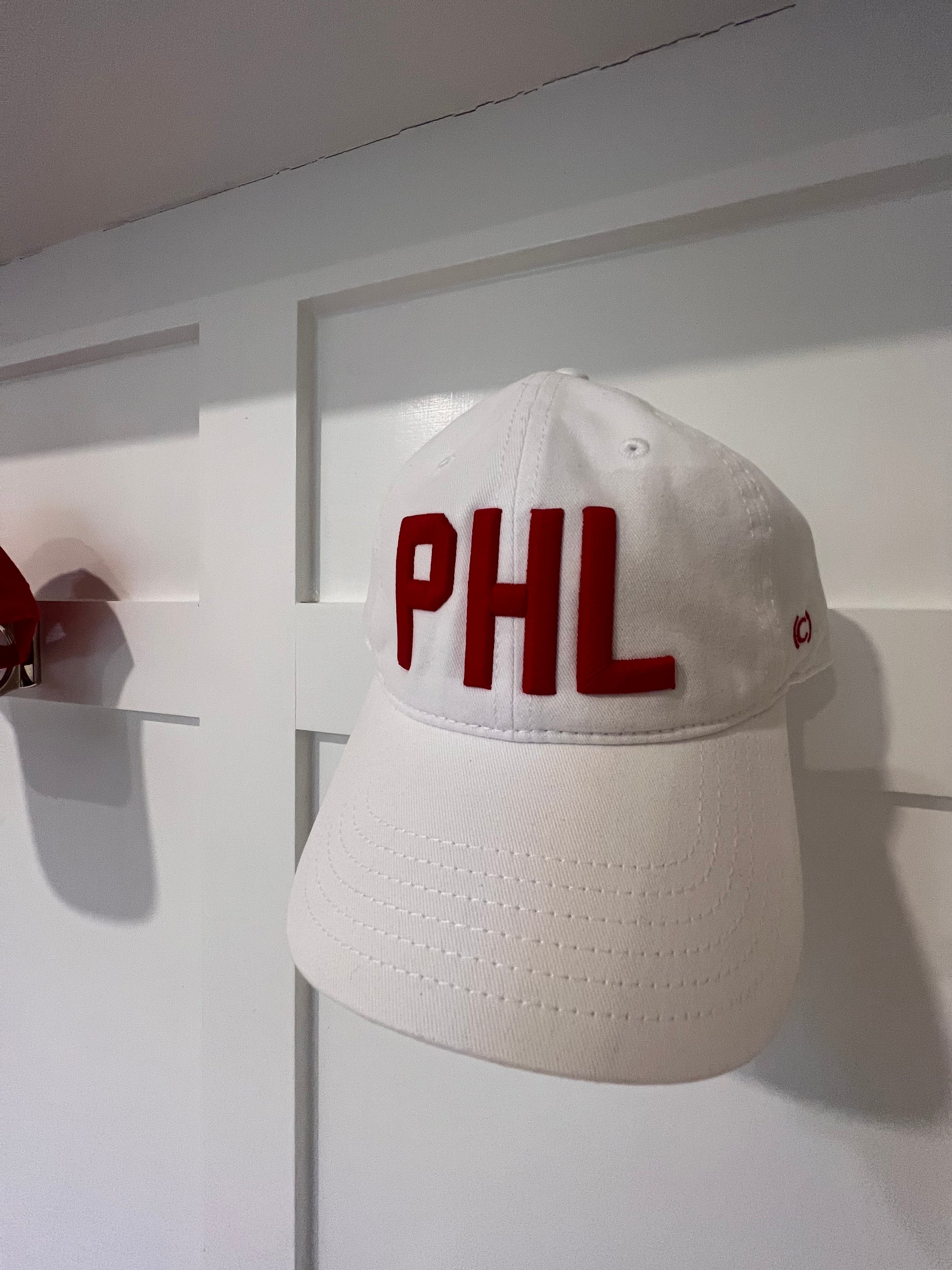 White hat with red "PHL" stitching. 100% Cotton Amazing Fit - Adjustable Brass Buckle With Cotton Strap.